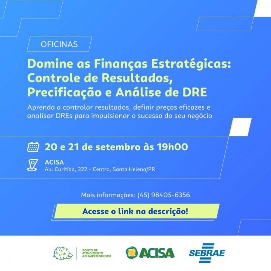 A Associação Comercial e Empresarial de Santa Helena (Acisa), por intermédio do Ponto de Atendimento ao Empreendedor do Sebrae, oferece dois cursos gratuitos voltados para a gestão financeira das empresas. As inscrições podem ser feitas clicando aqui. Quem precisar de mais detalhes pode entrar em contato pelo telefone (45) 3268 1497. Podem participar, tanto associados, quanto, não associados.