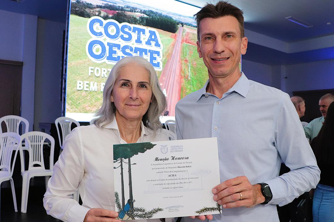 A Associação Comercial e Empresarial de Santa Helena (Acisa), recebeu uma menção honrosa da Assembleia Legislativa do Paraná por contribuir com a confecção de um anteprojeto que visa a melhoria de rodovias da região lindeira ao lago de Itaipu. A honraria foi entregue ao presidente, Rogério Volpi e à diretora consultiva, Claudete Remor, nesta quarta-feira (19), em Marechal Cândido Rondon. O documento visa melhorias das rodovias PR-495 e PR-497.