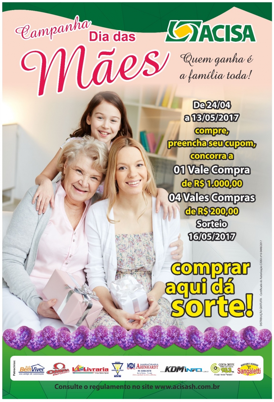 A Campanha de vendas do Dia das Mães inicia com expectativa bastante positiva em Santa Helena. São 62 empresas participantes para o sorteio de R$ 1800 em vales compras. O material para as empresas será distribuído esta semana. A promoção, integrante da Campanha Comprar aqui dá Sorte, inicia dia 24 de abril e se estende até 13 de maio. O sorteio está marcado para 16 de maio.