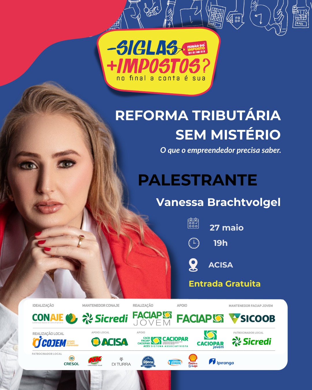 Uma das ações de destaque é a palestra gratuita “Reforma Tributária sem mistério: O que o empreendedor precisa saber”, que será realizada no dia 27 de maio (terça-feira), às 19h, na sede da ACISA. O evento é aberto ao público e terá como palestrante a advogada Vanessa Brachtvogel.