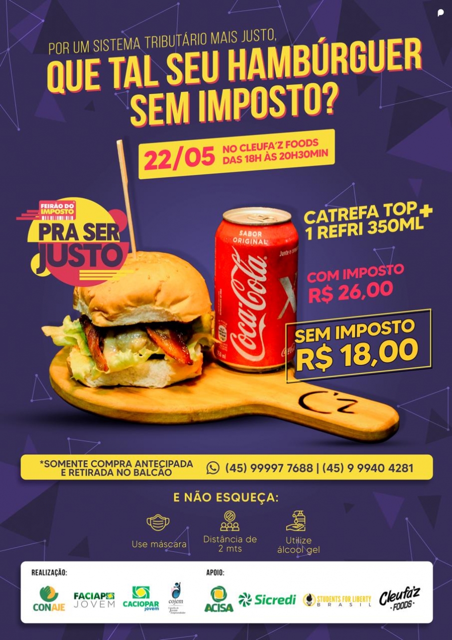 Em Santa Helena o ‘Dia D’ será 22 de maio quando o Cojem venderá lanches, sem a incidência de impostos. Neste caso o consumidor final pagará o lanche sem os tributos.