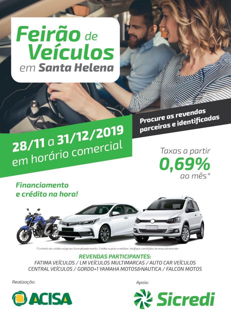 Uma parceria entre a Associação Comercial e Empresarial de Santa Helena (Acisa), com o Sicredi e empresas revendedoras de veículos, visa fomentar o comércio para o segmento no município. O Feirão de Veículos conta com a participação de seis revendedoras, tanto de automóveis, quanto de motocicletas. Diferente de feirões anteriores, nesta edição a exposição é feita nas próprias empresas e com duração maior, até 31 de dezembro.