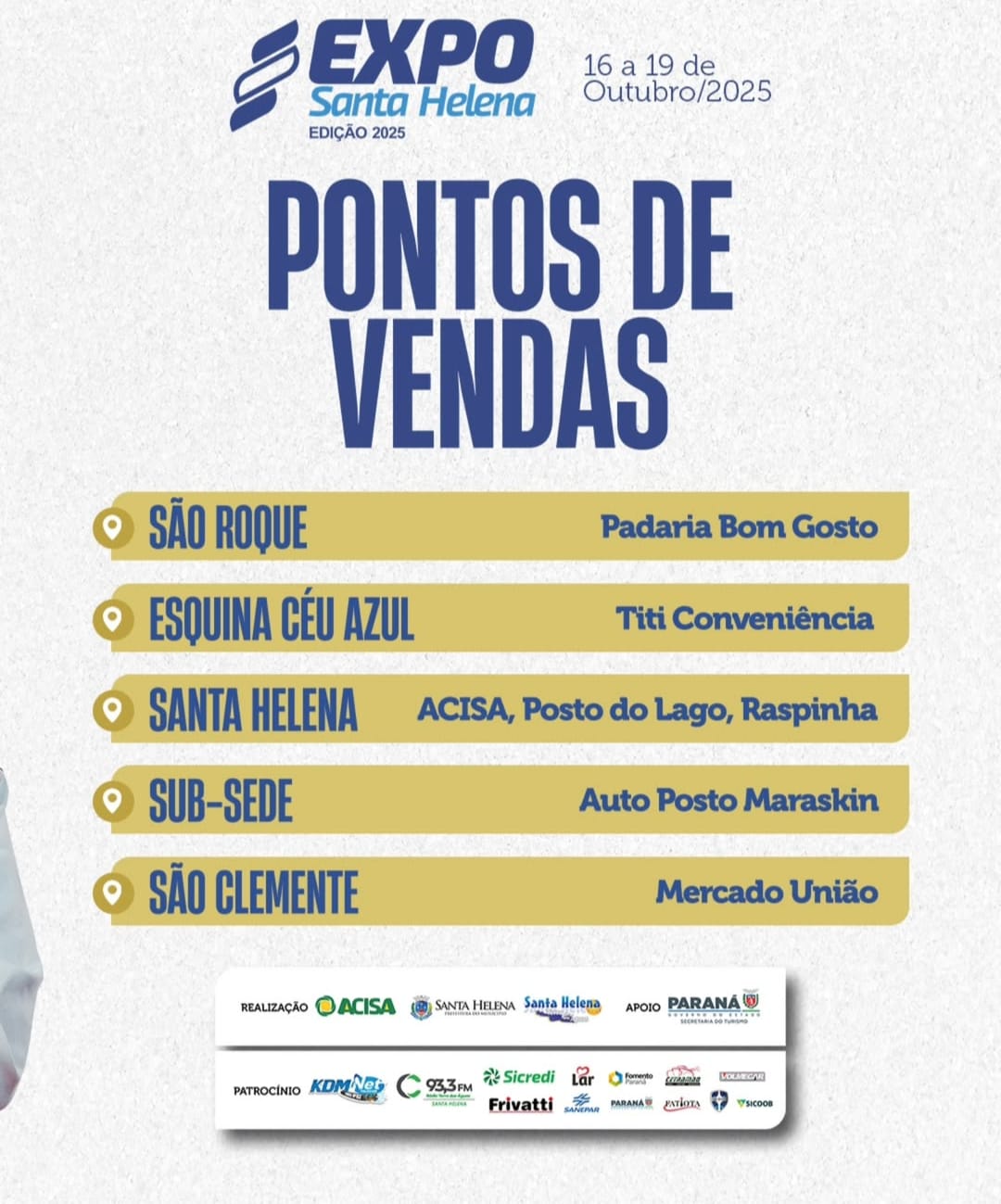 Os ingressos podem ser adquiridos em pontos de venda presenciais e também pela internet no site ingressonacional.com.br/exposantahelena2025. Nas compras online, incidem taxas administrativas, enquanto nos pontos físicos operações via cartão ou Pix podem ter custos adicionais.