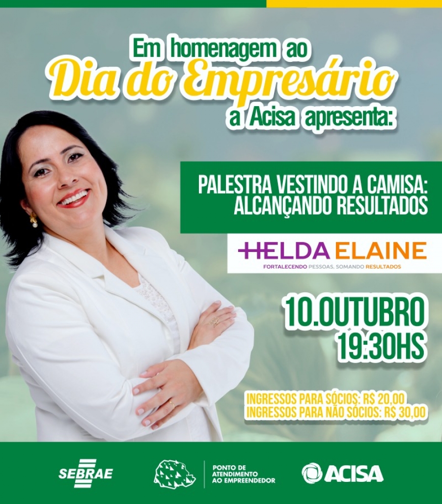 Em alusão ao Dia do Empresário a Associação Comercial e Empresarial de Santa Helena (Acisa), promove a palestra ‘Vestindo a Camisa: Alcançando Resultados’, com a palestrante Helda Elaine. O evento ocorrerá dia 10 de outubro às 19h e 30 minutos. Ingressos promocionais para associados a R$20 e não associados a R$30, podem ser adquiridos na Acisa. A difusão de conhecimento com estímulo à busca por inovação é uma forma de homenagem vinculada à oferta de conteúdo positivo, conforme os promotores.