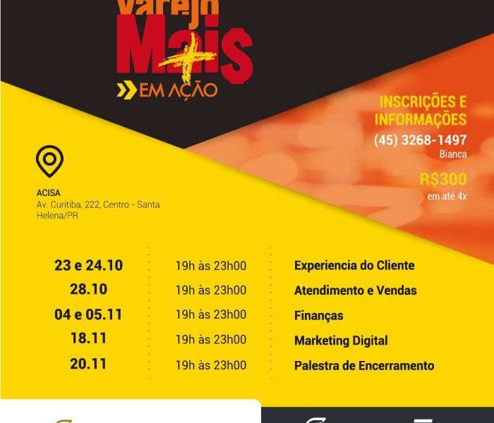 Em Santa Helena, a programação vai contemplar um período de autodiagnostico e desenvolvimento do plano de ação, além de workshops sobre temas que abrangem as principais tendências do comércio varejista como experiência do cliente; atendimento e processo de vendas; finanças e marketing digital.