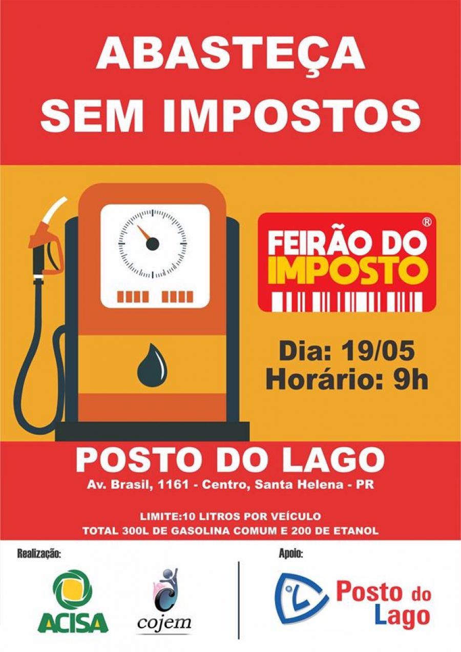 Uma promoção da Confederação Nacional dos Jovens Empresários (Conaje), no Brasil, o Feirão de Impostos, será realizada pelo Conselho do Jovem Empreendedor (Cojem), núcleo da Associação Comercial e Empresarial de Santa Helena (Acisa). Neste sábado (19), às 9h, na conhecida ‘Praça Central’, serão distribuídos 50 vales, cada um de 10 litros de combustível. Os vales dão direito de abastecer sem a incidência de impostos.
