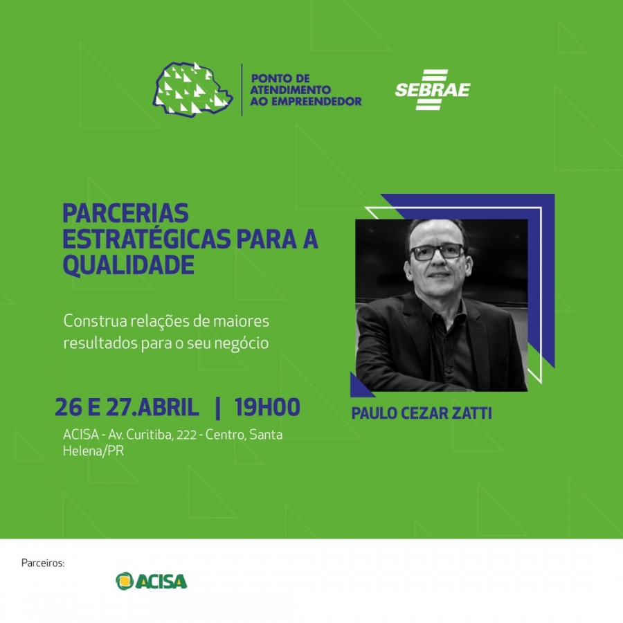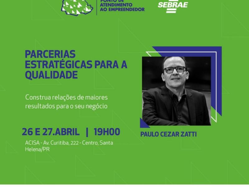 A Associação Comercial e Empresarial de Santa Helena (Acisa) e o Serviço Brasileiro de Apoio às Micro e Pequenas Empresas (Sebrae) promovem um workshop “Parcerias e Estratégias para a Qualidade”, destinado empreendedores que buscam aprimorar suas habilidades empresariais. A oficina “Parcerias e Estratégias para a Qualidade” será ministrada por Paulo Cezar Zatti, nos dias 26 e 27 de abril, na sede da Acisa, a partir das 19 horas.